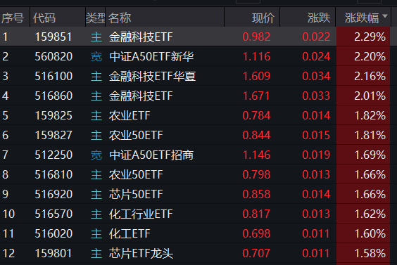 8月21日上午,股市小幅上扬,权益类ETF市场表现相对平淡,其中,金融科技ETF、农业ETF涨幅居前,储能电池ETF、科创新能源ETF等跌幅靠前。