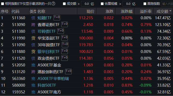 成交额方面,香港证券ETF居首,半日成交额超123亿元,A500ETF基金、港股创新药ETF等成交额均超过36亿元。