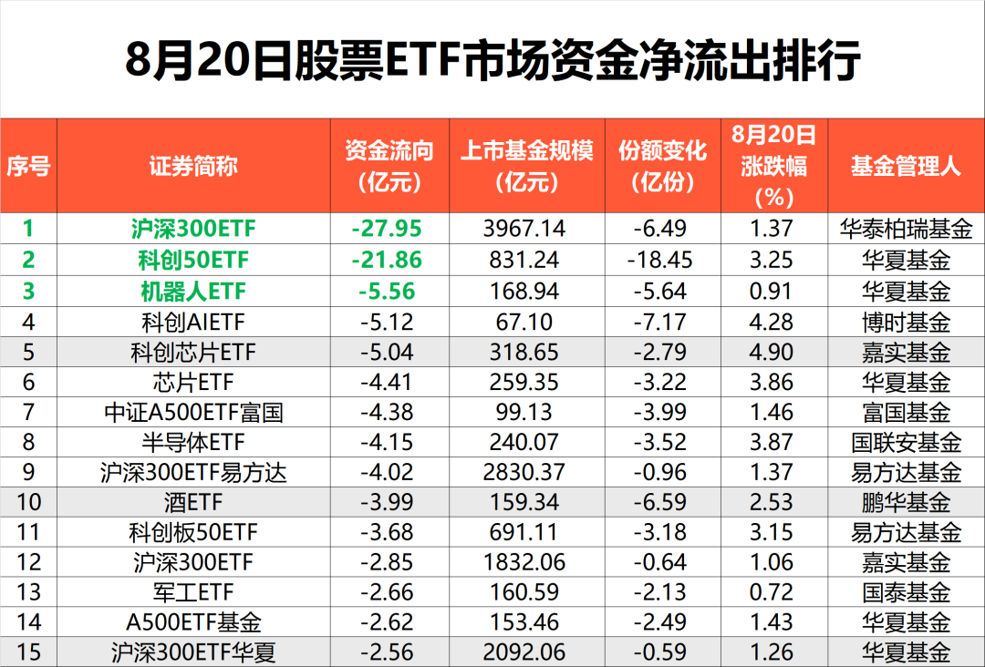 Wind数据显示,截至8月20日,全市场1177只股票ETF(含跨境ETF)总规模达3.99万亿元。在昨日股市上涨行情中,股票ETF市场总份额减少8.34亿份,按照区间成交均价测算,净流出资金为38.65亿元。